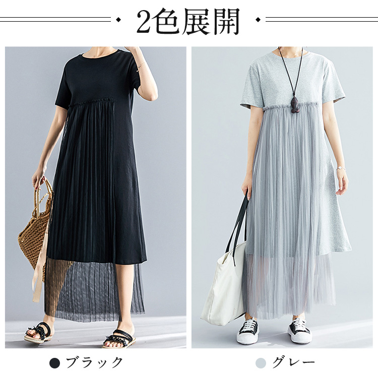 ミモレ丈ワンピ 切替 綿 チュール プリーツスカート 透け感 ゆったり aライン きれいめ